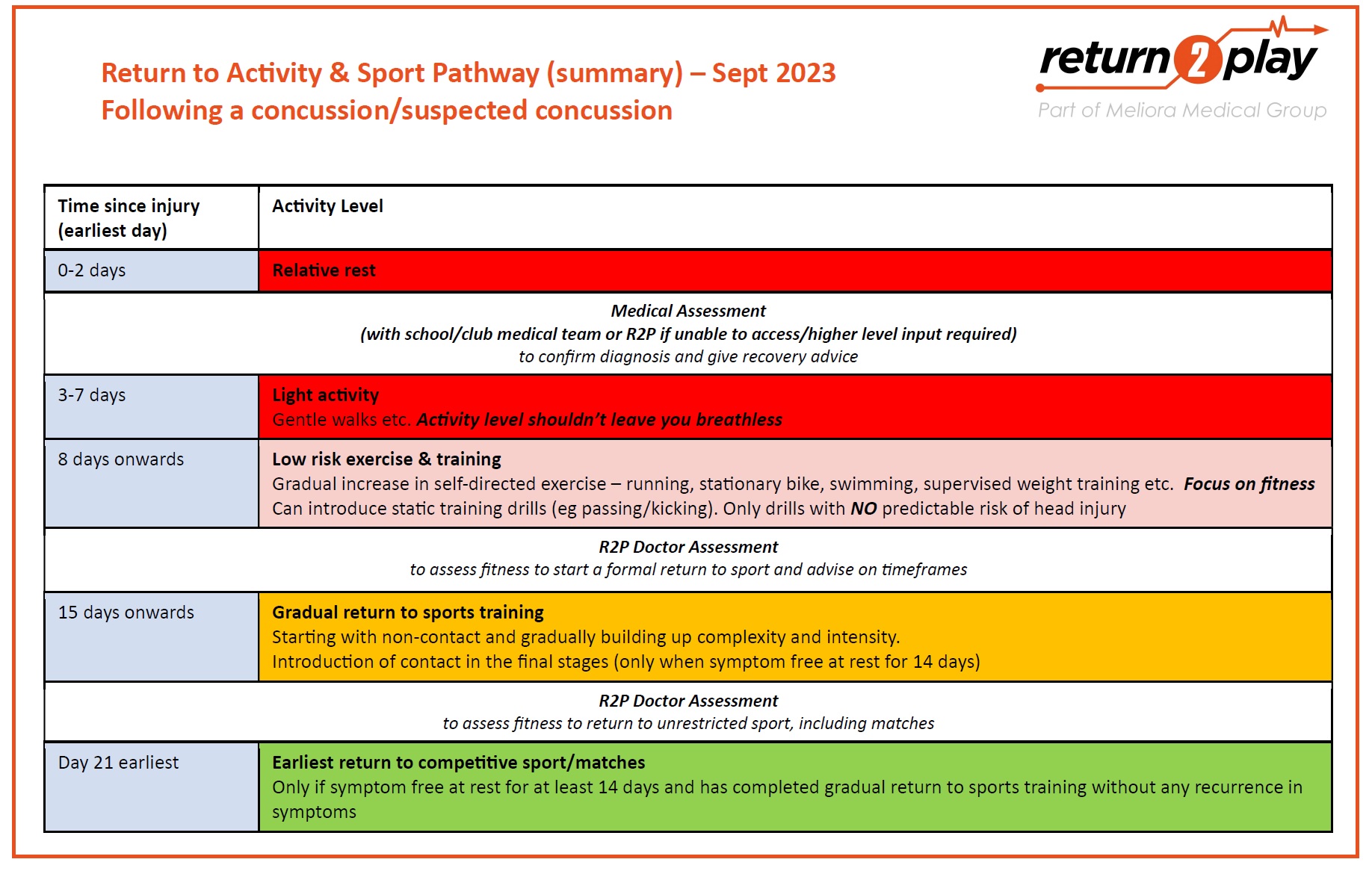 As long as they are symptom-free and have fully returned to normal life and light exercise, a return to sport can start after 14 days. Return to sport should follows a phased process, gradually increasing the amount and intensity of activity. Activities with a risk of contact should be the final stage of a return. Return2Play’s pathway requires medical assessments prior to returning to sports training and then at the end of the graduated return-to-play period, before a player can be cleared as safe to return to sport.